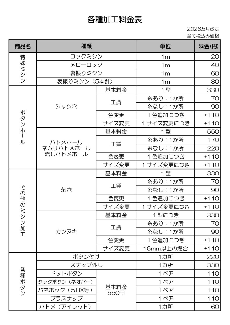 各種加工料金改定のお知らせ 2026/04/15 日頃より洋装ひまわりのご利用いただきありがとうございます。 昨今の物価高騰に伴い、2026年5月1日より、各種加工料金を値上げをさせていただきます。 5月1日より表の価格となりますので、ご確認ください。 また、加工につきましては、当日お渡しのお約束はできませんので、期日に余裕をもったご依頼の程よろしくお願いいたします。 今後とも、洋装ひまわりをよろしくお願いいたします。