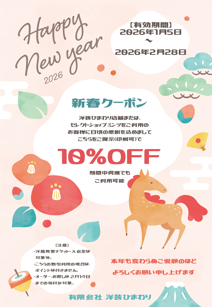オーダー・お直し・生地などほぼ全品10%OFF!(教室のチケット・入会金は対象外となりますので、ご了承ください。)